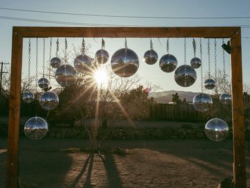 Built on a custom wooden rig measuring 10 feet wide by 8 feet high, the Disco Wall forms an open arch of suspended disco balls, creating a striking focal point that still allows guests to see through to the surrounding landscape.